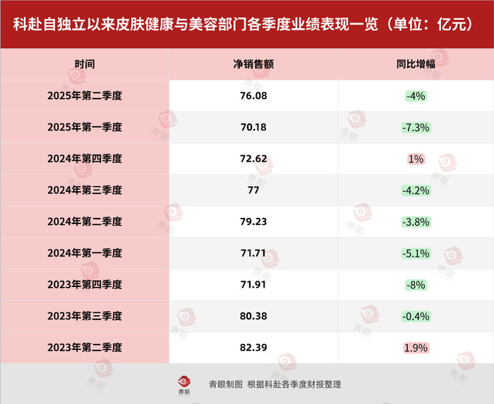 总的来看,在科赴独立后披露的9个单季度的财报中,皮肤健康与美容部门就有7个季度录得了净销售额的同比下滑。