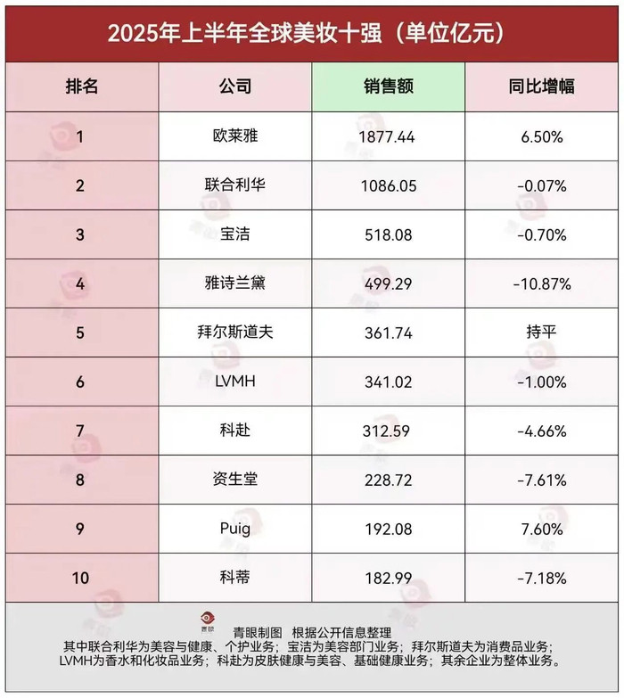 值得关注的是,在2025年上半年全球美妆十强榜单中,科赴以312.59亿元的销售额排在第7位。若该公司整体出售或分拆皮肤健康与美容部门,则不论以该部门业绩计,还是以科赴剩下的美妆业务计,均难以进入全球美妆十强榜单。