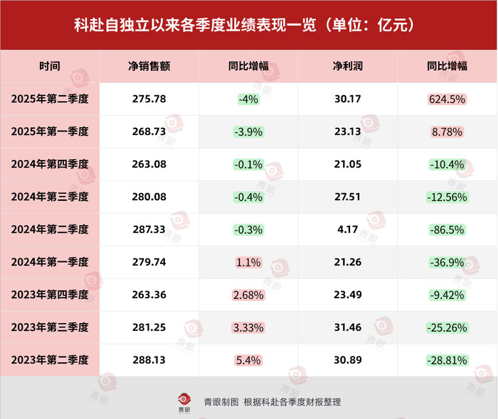 此外,从科赴整体的业务来看,其自独立以来,也出现高开低走的局面。在2023年第二季度到2024年的第一季度的前4个季度中,该公司还保持着净销售额的同比增长。然而,自2024年第二季度开始,该公司的净销售额就出现了连续5个季度的同比下滑。